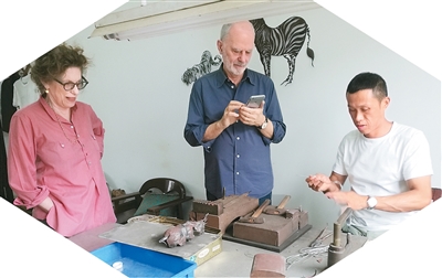艺术的价值可以跨越文化背景,芜湖铁画正在更多艺术创作中“融入世界”。国际设计师布拉德·戴维斯曾为爱马仕家居系列设计地毯,他对铁画的独特工艺有着浓厚兴趣。为此,他和夫人一起来到芜湖,学习、了解这门技艺。戴维斯与储铁艺共同创作了3幅大型人物肖像铁画,作品高达1.5米至1.7米,吸收西方速写风格与复杂空间结构,兼具传统锻造技艺与现代艺术语言。